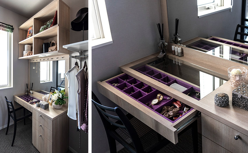 使う人によって好みや使い方に差が出るドレッサーは、造作で理想を追求するのも良いでしょう。寢室やウォークインクローゼット、洗面室など設置する場所に合わせたサイズでつくったり、収納したいアクセサリーや化粧品の容器のサイズに合わせた引き出しを設置したりするのも可能。収納したアクセサリーなどが見えるように一部をガラス張りにした天板や、部屋全體の明るさに応じた補助照明を取り入れるなど、自分の使い方にぴったりのドレッサーを実現できます。