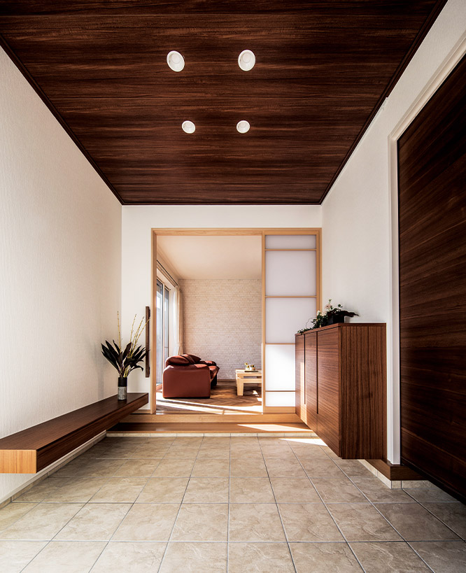 玄関には、フロートタイプのシューズボックスを造作して設置すると、掃除がしやすく、清潔な狀態を保つことができます。また、靴を履く時などに腰掛けられるフロートのベンチを設けておくことで、足腰にも優しい配慮のある玄関になります。
