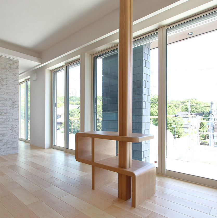設計上動かせない柱を空間になじませるため、造作を取り入れるという手法もあります。柱に巻き付けるように曲木の棚をデザインし、インテリアの一部に見せることで、柱の存在感を消すことができます。