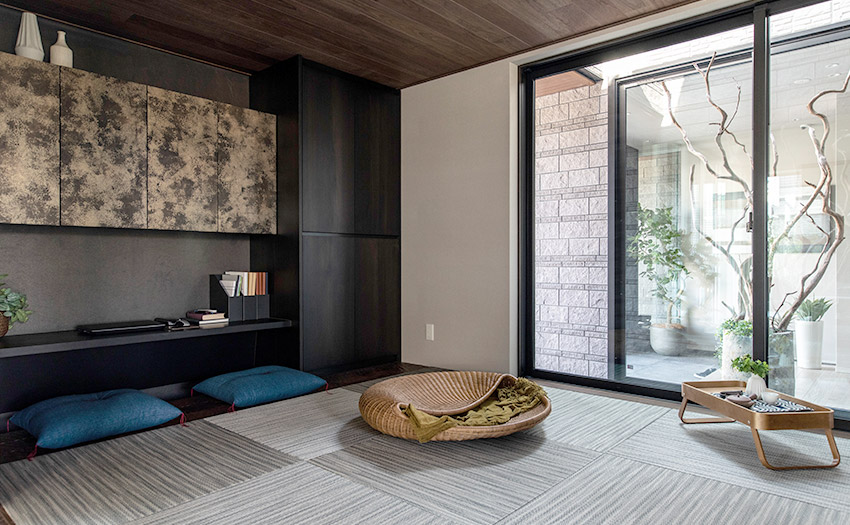 タタミコーナーに造作したカウンターと吊り収納。足を下ろして座れる掘り込みのカウンターには、テレワークスペースとしての利用も想定して照明や電源を設置しています。吊り収納には和風のクロスでアクセントをつけています。