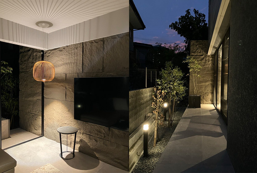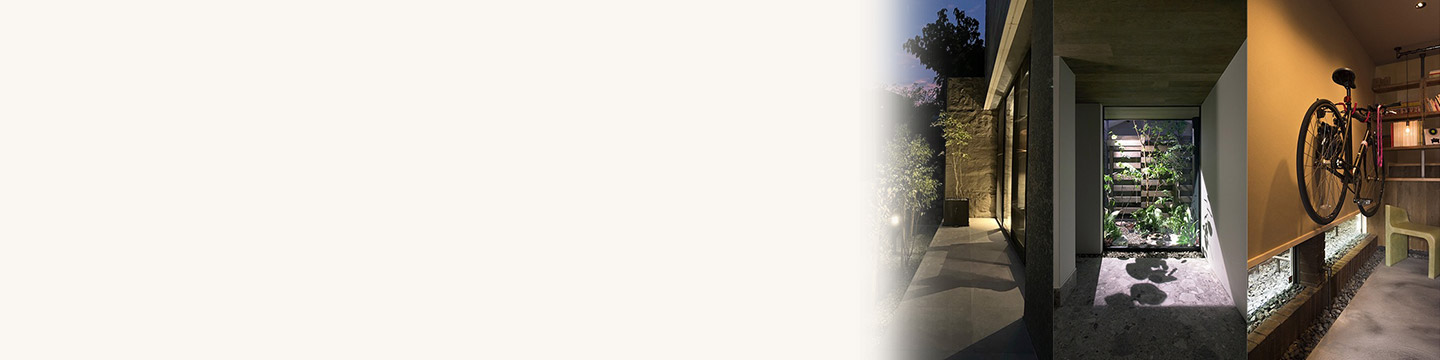 また、屋外に設置したガーデンライトの明かりは、玄関の間接照明としても機能しています。広さを必要としない外空間の生かし方ですね。私はこれも庭の一つだと捉えています。