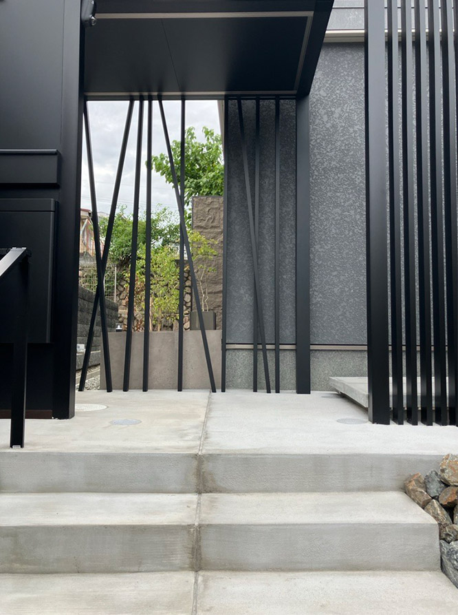 まずはこちらのKさま邸から見ていきましょう。道路と玄関の間につくったフロントガーデンです。正面にある玄関ドアまでのアプローチ脇に、植栽や石を配置して雰囲気を高めています。最大幅2.3mほどのスペースですが、あえて石などを避けながら進むシークエンスの手法を取り入れて、魅力的に演出しています。