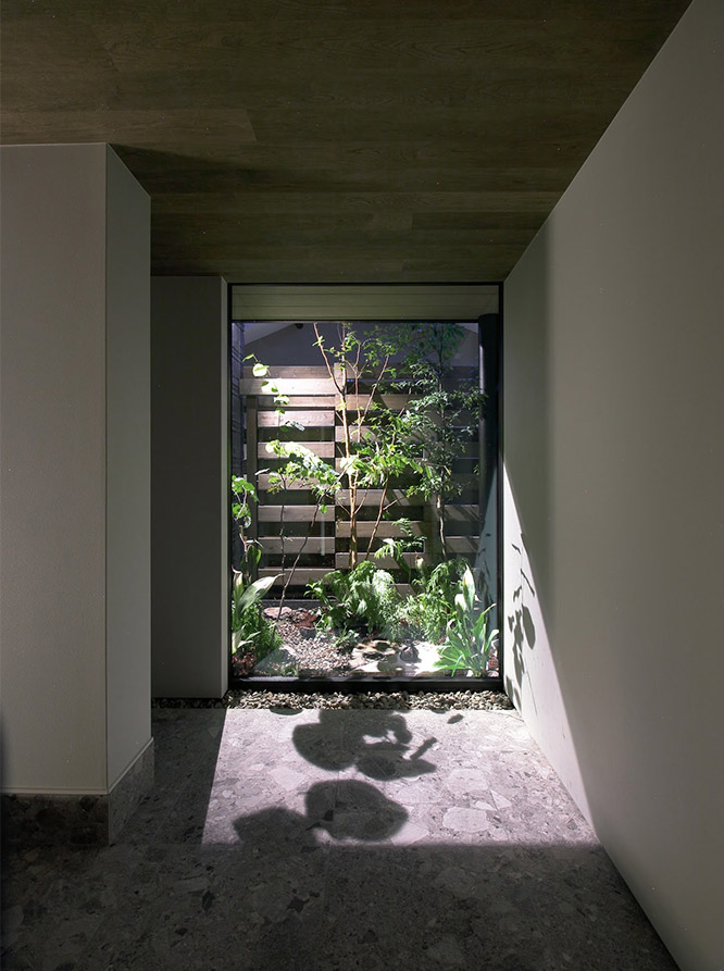 こちらは、玄関アプローチから外構の柵越しに先ほどの庭を見たものです。ルーバー(格子)の奧に何らかの外空間があると見て取れるものの、意図的に玄関から直接庭にアクセスできないようにしています。それによって防犯上の役割を果たしつつも、庭の全貌を隠すことで見えない部分への想像をかき立て、家に深みを與える効果があります。