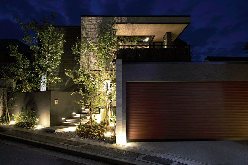 アプローチのステップ脇に植栽スペースをつくったフロントガーデンです。ご近所とのコミュニケーションのきっかけをつくるなど、フロントガーデンは家と街をつなげる役割を持っています。植栽やガーデンライトが良い雰囲気を生み出し、街並みにも貢獻しています。
