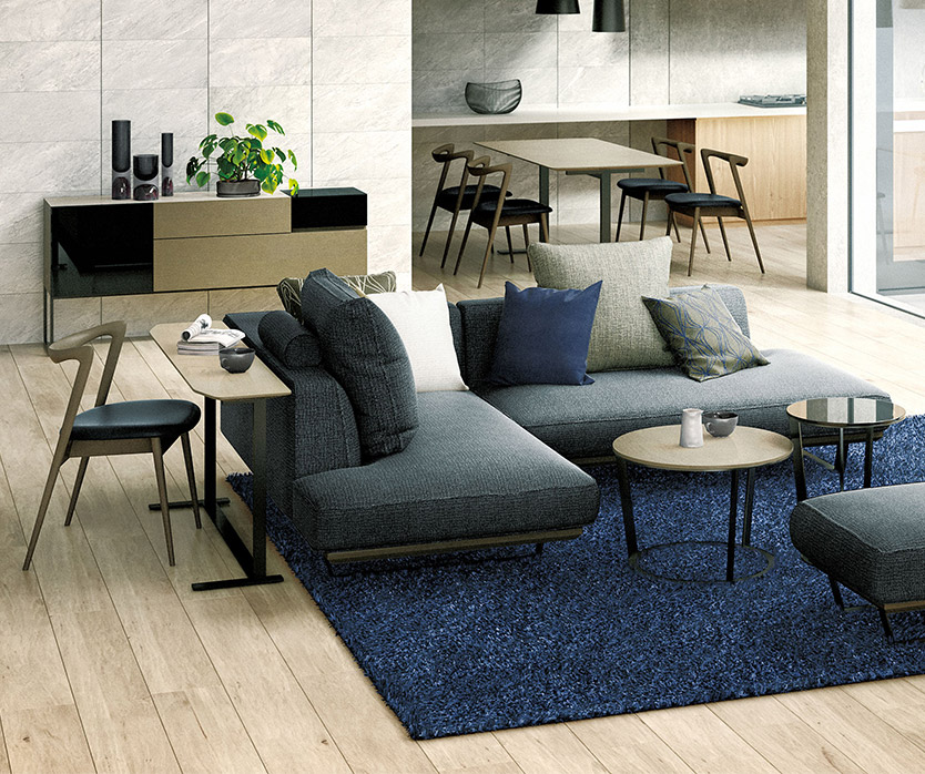 家族が各自の部屋で過ごすのではなく、リビングでそれぞれがしたいことをする、「家族がリビングでつながるコミュニケーション」が重要視されています。そのため、リビングでの過ごし方が多様化し、多目的に使えるソファが人気です。寫真のように座面が広く、組み合わせが自由にできるソファなら、好きな方向に腰掛けることができます。