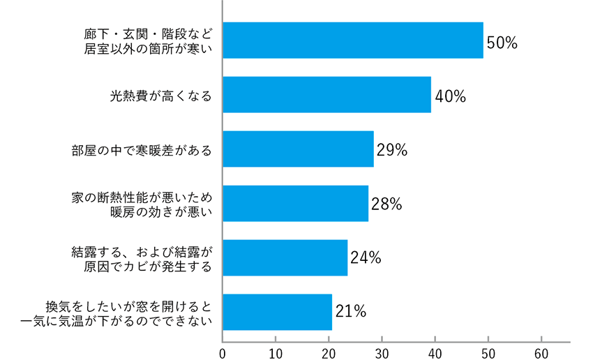 しかしながら、「特にない」33%を選んだ人も依然、高い水準になっています。寒さは毎日身を置いていると慣れてしまうものでもあります。感受性が鈍ってしまっても、前述のように自分以外の家族の暮らしや健康を脅かしている可能性も考えながら、時には住まいを見直すことも必要です。