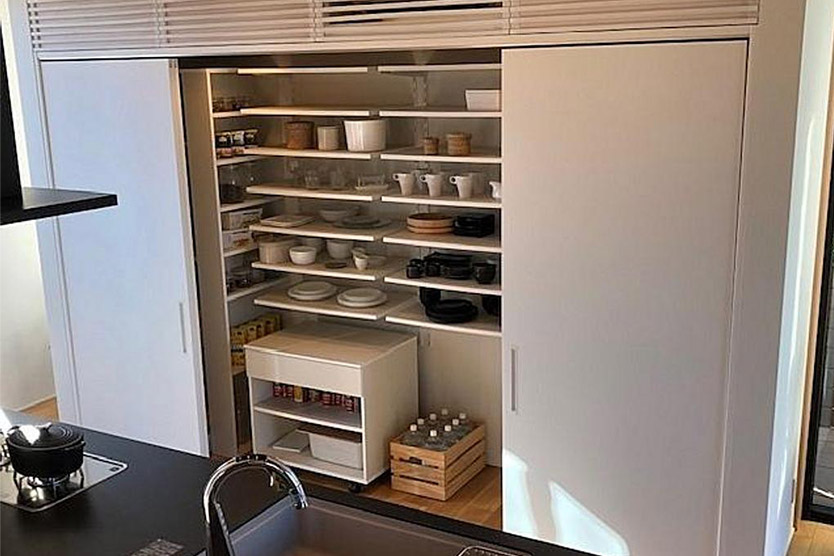 パントリーとは、キッチンやダイニングの近くに設置する収納のことで、食品庫とも呼ばれます。主にお米やパスタ、缶詰や調味料などの食品のほか、調理器具や食器、キッチンペーパーなどの消耗品をストックしておくことが目的です。人數が多いご家族や共働きの方におすすめです。