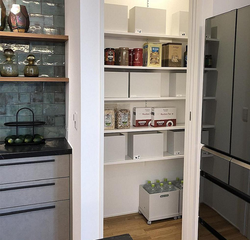 また、上記でご紹介した通り、ネットスーパーなどでまとめ買いしたペットボトルや常溫保存できる食材は、パントリー(食品庫)があると余裕を持って収納できるため、キッチンに収納を増やしたい場合はぜひ検討してみてください。