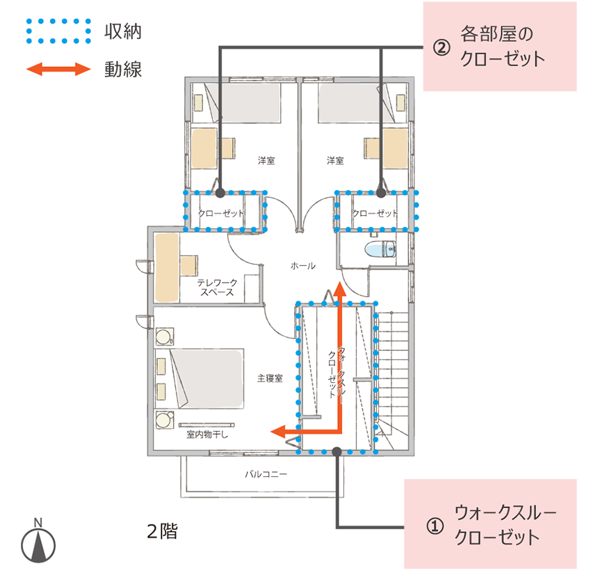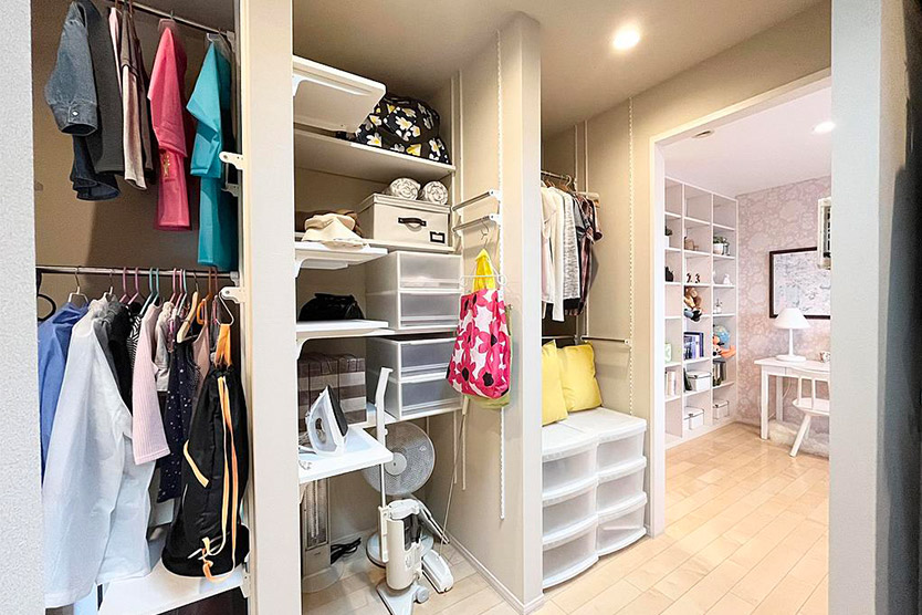 ①2WAY動線のウォークスルークローゼットは、主寢室から入って衣類を取り出すことはもちろん、身支度をすませたらそのまま移動できます。大容量の収納なので日常的に著る洋服のほか、シーズンオフの衣類やアイテムなどもしまっておくことができ、居住スペースがすっきり片付きます。