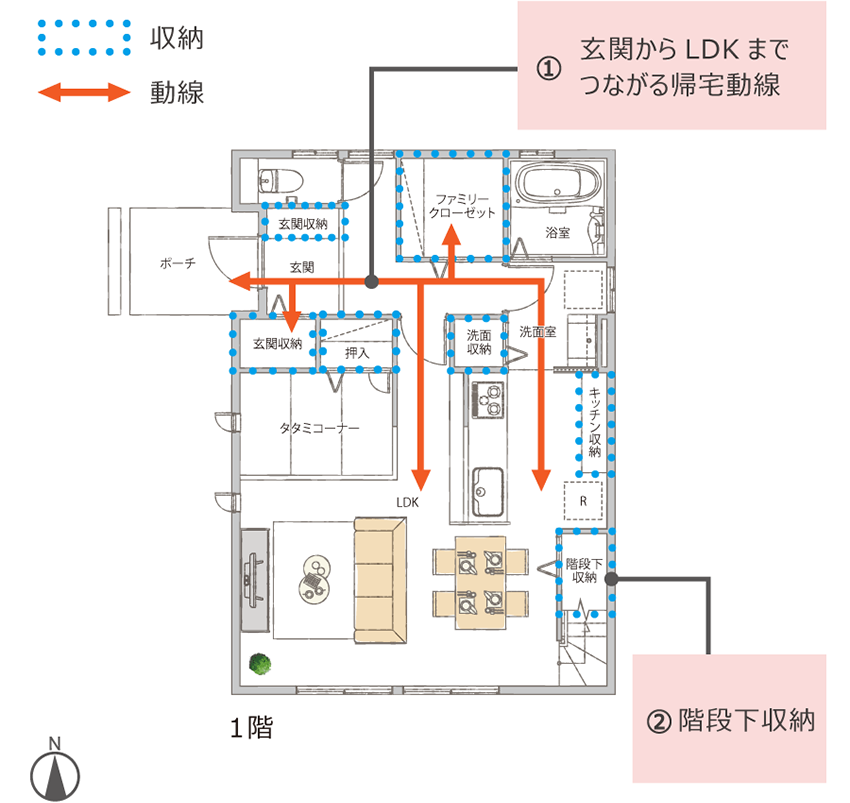 ①玄関にはシューズボックスのほか、外で使ったものをそのまましまえる土間収納があります。玄関から洗面室、ファミリークローゼット、リビングへとつながる動線にすることで、帰宅してからリビングでくつろぐまでに荷物をしまい、手を洗って部屋著に著替えることができるため、リビングにコートやバッグを置いたままということも減りそうです。