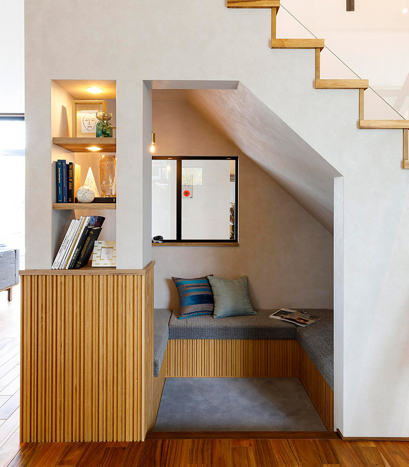 ②生活の中心となるLDKにも、適材適所で十分な収納を設置しています。特に、デッドスペースになりがちな階段下のスペースを、階段下収納として活用するアイデアが光ります。