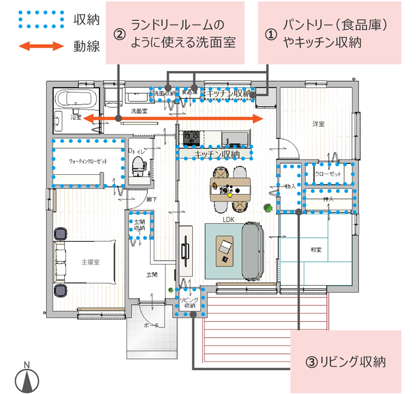 収納を計畫する際は、使う物の近くに収納を設けることが一番のポイントです。家事動線や生活動線をイメージしながら、使用頻度などを考えて収納場所を決めましょう。將來の暮らしの変化を見據えて、余裕を持たせておくとよいでしょう。