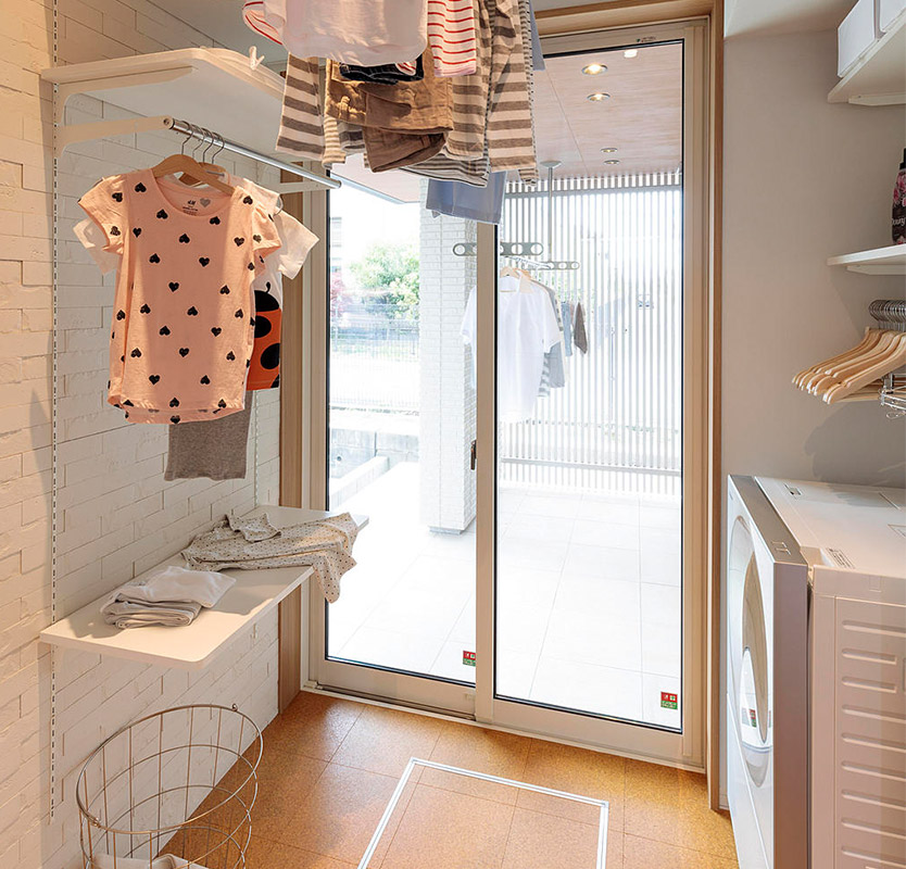 ②洗面室には、洗剤などのストック品だけでなく、タオルや肌著などもしまえる収納、室內干し設備があります。折り畳みテーブルなど作業臺を持ち込めば、「洗う?干す?畳む?しまう」を1カ所で行えるランドリールームとしても活用できます。