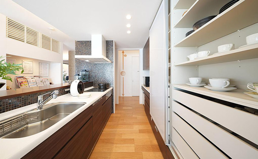 ①キッチンでは、パントリー(食品庫)や、キッチン収納が手の屆く位置にあり、料理の効率を高めてくれます。