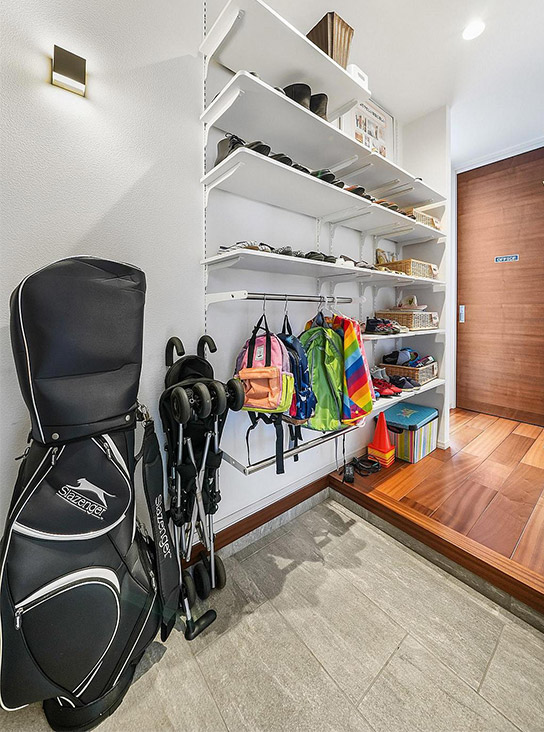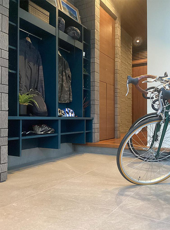 その名の通り、靴を履いたまま出入りできる土間になっているので、ベビーカーやキャンプ用品、ガーデニング用品、小型の自転車など、外で使うものの収納にも便利です。