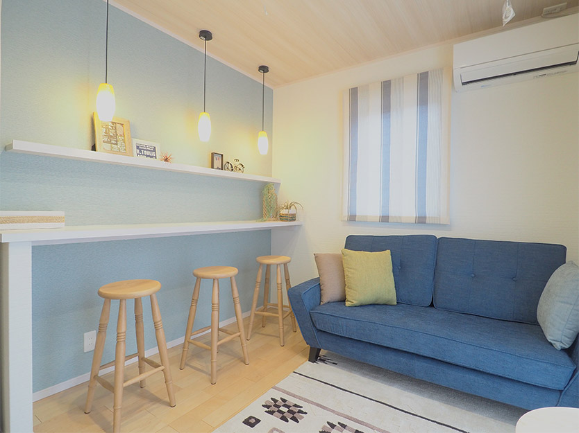リビングの一角に幅170cm、奧行き45cmの造作カウンターを設置して、ワークスペース兼3人のお子さまの勉強スペースをつくりました。落ち著いたブルーの壁紙がインテリアのアクセントになっています。