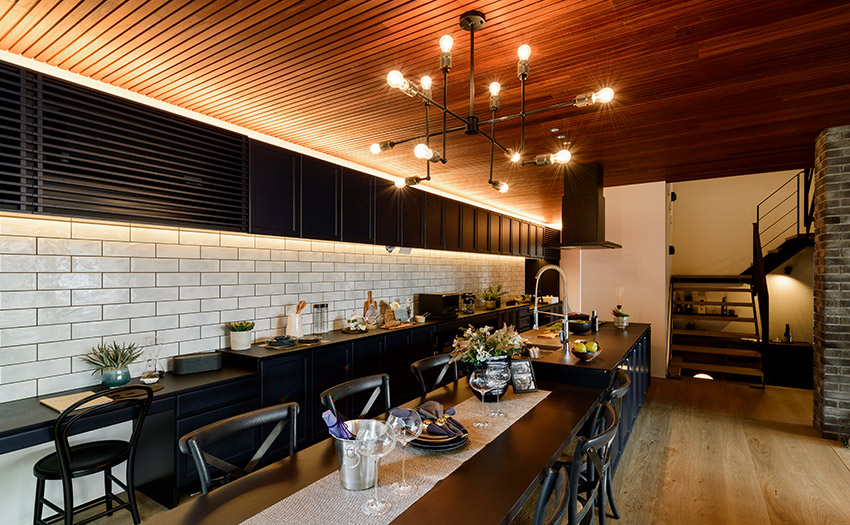 カウンターキッチンの上部からデザイン性の高いペンダントライトを吊り下げたり、キッチンの天井や背面収納壁面に間接照明を取り入れたりすることもできます。作業(yè)に必要な明るさは確保しつつ、キッチンに立つのが楽しみになるようなさまざまな光の演出が可能です。