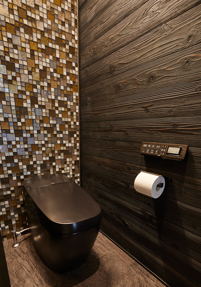 こちらはトイレの床や壁、設備までをブラウン系で統一した當社のカラードレンチングの実例です。木目調の壁やタイルなど、同じ色でも素材を変えることで、空間にリズムが生まれます。カラードレンチングをするなら、アースカラーで統一すると落ち著いた空間に仕上がります。