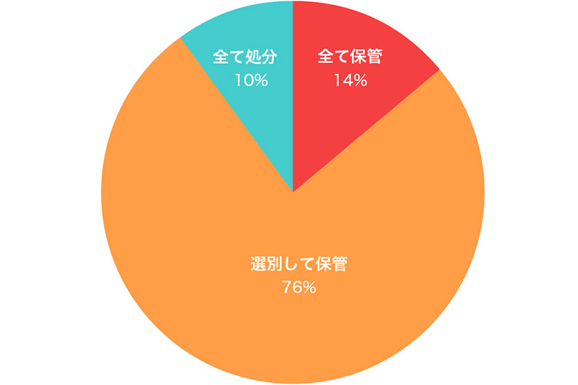 「全て処分」という方は少數の10%。「選別して保管」76%と「全て保管」14%を合わせると「90%の方が思い出の品を何らかの形で保管」していますね。「自分でつくったモノだからずっと置いておきたい!」というお子さんと、そんなお子さんの気持ちをできるだけ大事にしたいと考えている親御さま。家族それぞれの思いが見えてくるようです。