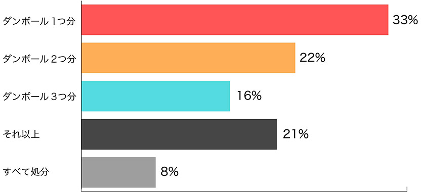 ちなみに保管してある量としては段ボール1つ分」が33%、「段ボール2つ分」が22%、「段ボール3つ分」が16%、「それ以上」と回答されたのは21%という結果。お子さんの人數はわからないものの、「決して少なくはない量のモノをおうちに保管しているのがわかります。