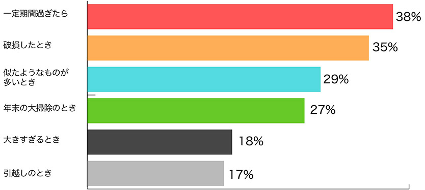 次いで多かった回答は「破損したとき」。持ち帰ってきた工作で子どもが遊んだりすると破れたり壊れたりすることも。でもそれなら、子どもも納得して処分しやすいタイミングともいえそうです。