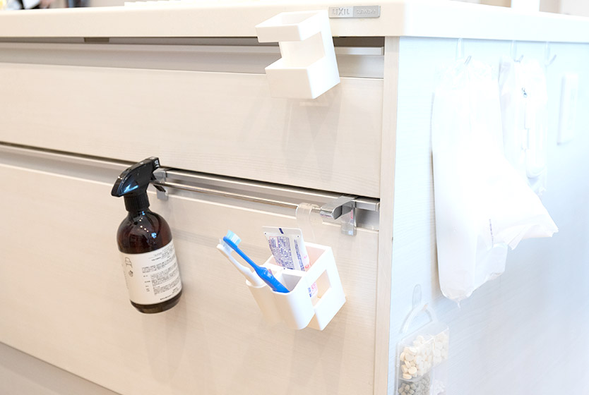 • ――キッチンカウンターのシンク側を拝見すると、こんなところに歯磨きセットやティッシュがフックで引っ掛けられていますね。