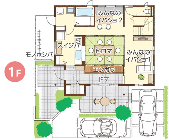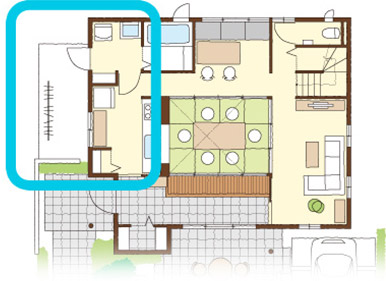 住まいの中心にあるヒロマと緩やかにつながりながら、比較的プライベートな場所として使いこなしていけるのが、1階に2カ所設けられた、みんなのイバショ。広めの1カ所には、ソファやローテーブル、テレビやオーディオ類を設置して、リビング感覚で使いこなせるスペースにしてみましょう。みんなでお出かけしたときに撮影した思い出のDVDを観たり、子どもに絵本を読んであげるのにも、ぴったりの空間です。大勢のお客さまが遊びに來たときは、ヒロマの建具を開放し、みんなのイバショも含めた広々としたワンルーム空間としてくつろぐこともできます。