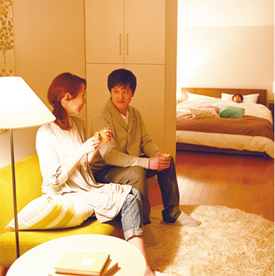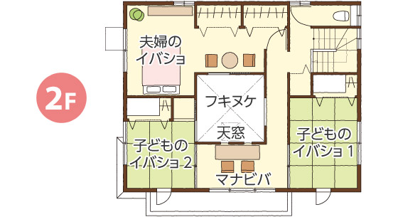 小さいうちは子どもといっしょに寢起きしたいけれど、成長したらやっぱり夫婦だけの寢室が必要になるもの。そのときのためにも用意したのが夫婦のイバショです。ベッドを置くスペースだけではなく、テーブルを置いたりしてちょっとくつろげる、ゆとりをもたせた造りになっています。ここで、夫婦だけの空間と時間を共有しあうことで、いつまでも親密なコミュニケーションをはぐくめるんです。子どもの進路や家計などについて、夫婦でじっくり語り合いたいときにも便利。おうちの中で少し獨立した部屋になっていますが、フキヌケに面しているため、小窓を通して住まい全體の気配を感じ取れます。