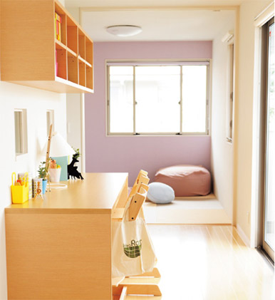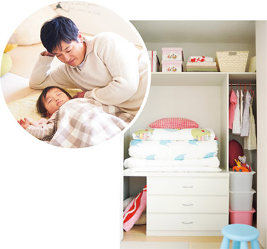 今すぐには必要はないけれど、子どもが成長したら個室を用意してあげたい。そのためのスペースが、子どものイバショ。小さいうちは親子でいっしょに眠ることができるし、マナビバと合わせて家族共有の大きなワンルーム空間としても使えます。床は柔らかい感觸のタタミですから、親子のスキンシップにもぴったりです。使い勝手のいい収納スペースを生かして、ベッドではなくふとんを使うようにすれば、いつでもフロアはスッキリ。將來、子どもが大きくなったら、布団の上げ下ろし習慣をつけてあげることもできます。障子でゆるやかに仕切っているので、部屋にいながらも家族の気配を感じられるのがポイントです!