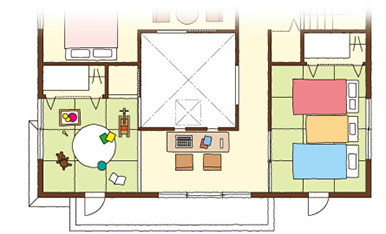 また、地域の子どもたちが集まって、みんなでわいわい遊ぶにもぴったりのスペースになります。明るい日ざしを取り込む大きな窓を開けておけば、屋外テラスと段差なくつながるので、広々とした庭感覚で過ごすこともOKです。