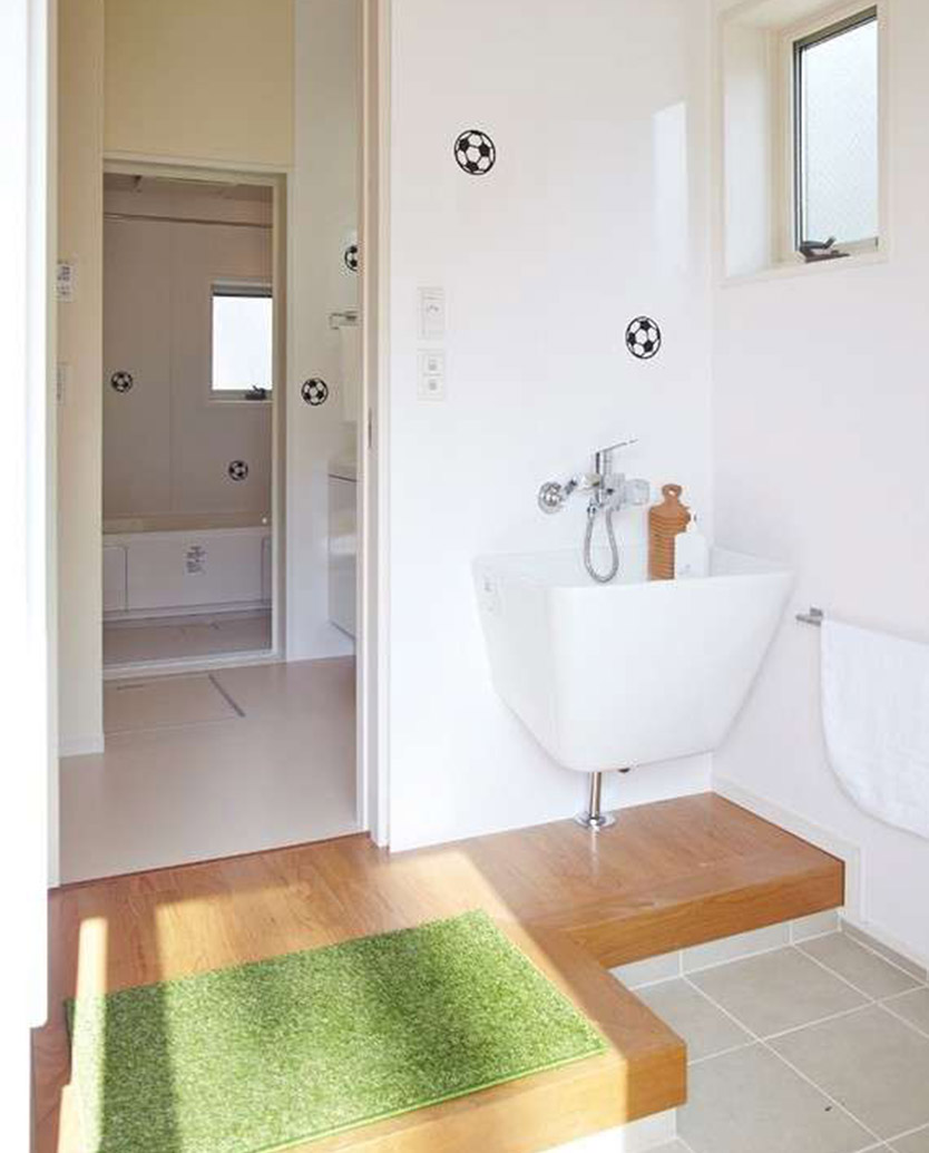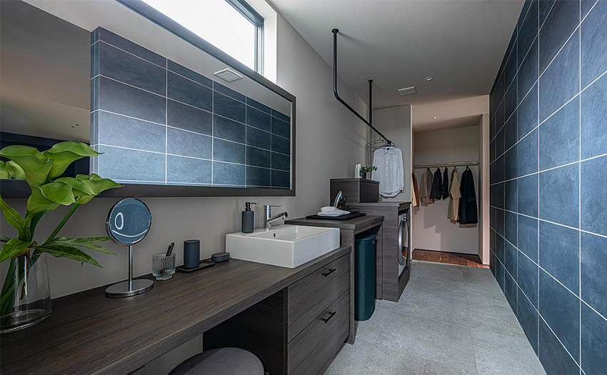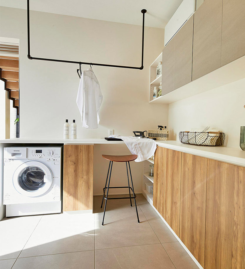 - 洗濯のプロセスのほとんどが行えるランドリールームがあると便利。ランドリールームとバルコニーやウッドデッキを近くに配置すると、部屋干しと外干しの使い分けがしやすく、急な雨で洗濯物を取り込んだ後もすぐに部屋干しできる