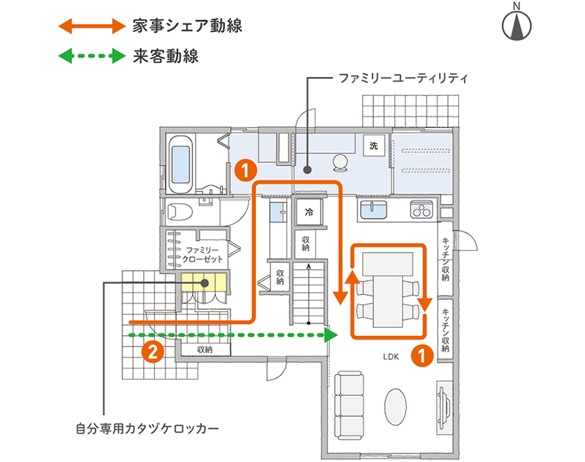 ①家事シェア動線/帰宅後すぐに上著や靴を「自分専用カタヅケローカー」にしまい、ファミリーユーティリティやLDKにアクセス