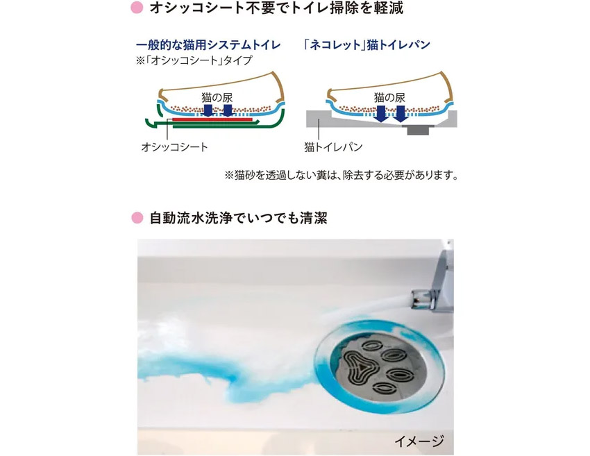 自動洗浄トイレはここが畫期的! 「オシッコシート不要!自動流水洗浄」