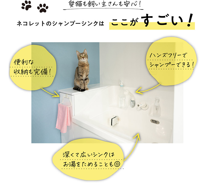 自宅シャンプーが手軽にできる幅広深型シンクと自動で流水洗浄してくれるトイレパンを備えた貓用水洗設(shè)備です。ハンズフリーでシャワーができたり、お湯をためて全身浴が可能だったり、愛貓と飼い主さん両方のストレスを軽減してくれる機能が充実。自宅シャンプーに挑戦したい方にこそ、おすすめです。