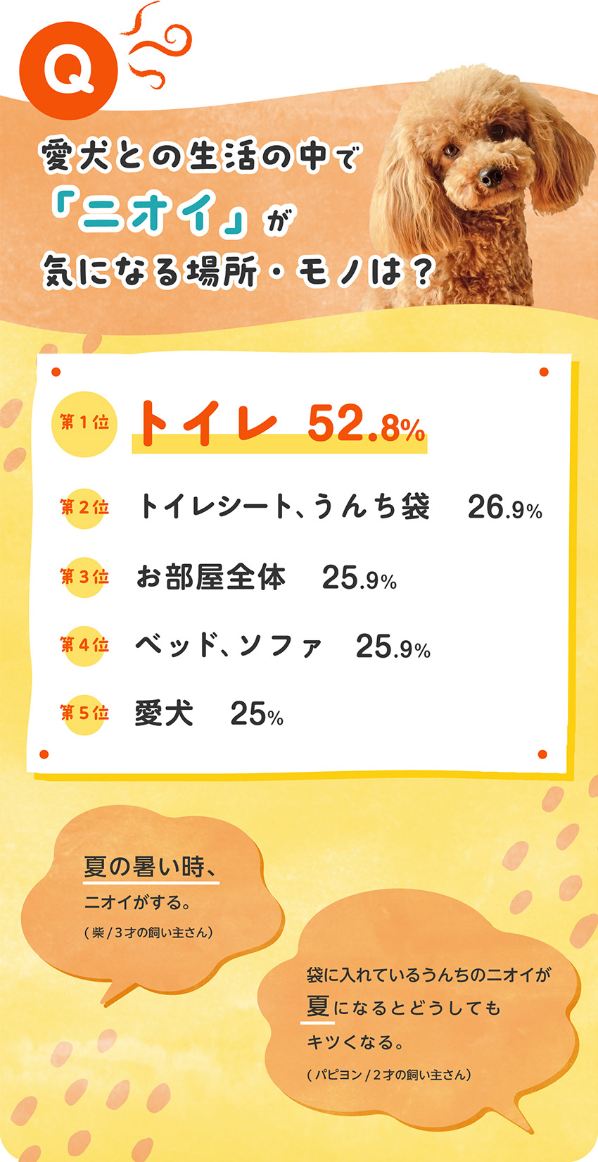 「いぬのきもちアプリ」では、犬の飼い主さん108人にニオイに関するアンケートを?qū)g施しました。その結(jié)果、多數(shù)の飼い主さんが愛犬との暮らしの中でさまざまなニオイを気にしていることがわかりました。特に「トイレ」については、2人に1人の飼い主さんが気になると回答しています。