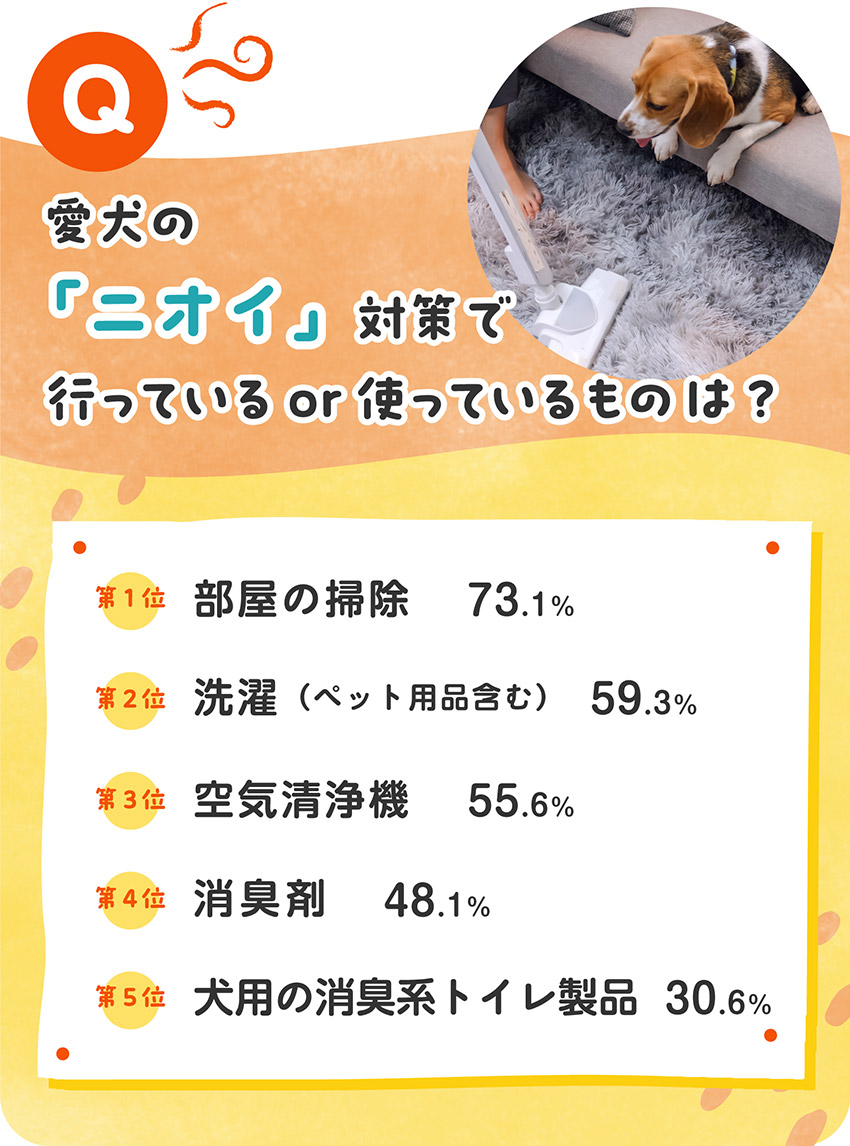 各ご家庭で行っているニオイ対策についてさらにアンケートを行ったところ、洗濯や消臭剤を使用してニオイ対策を行う飼い主さんが多いこともわかりました。しかし、犬にとってニオイの取りすぎは注意が必要なこともあるようです。