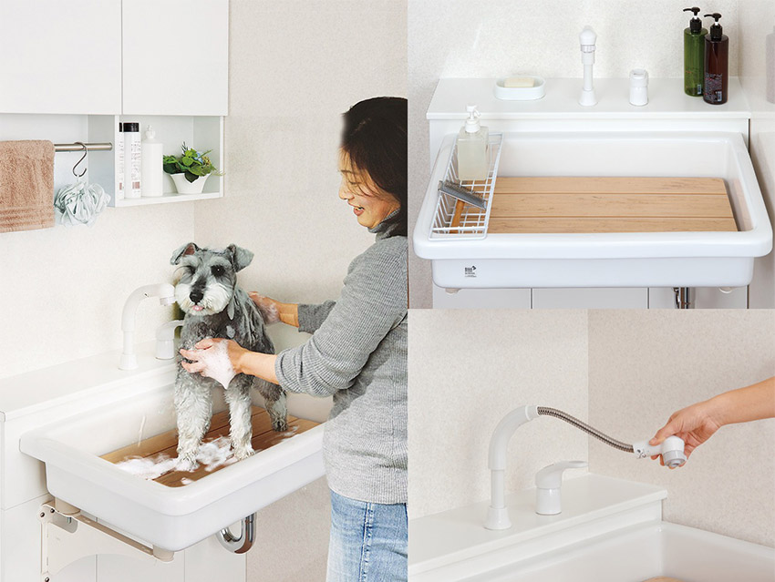 「マルチシンク」はペット専用のシャンプー設備です。愛犬と飼い主さんの負擔を軽減し、快適で安心しておうちシャンプーを行える工夫がたくさんあります。