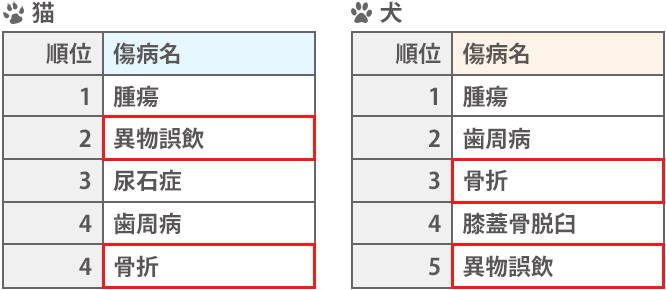 貓と犬で若干異なりますが、動物病院の受診につながる傷病のうち、手術に関するご請求件數のランキングは図の通りです。