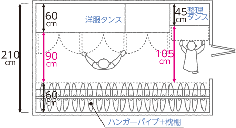 「たたむ」より「掛ける」方が、出し入れするのも衣類を管理するのもラクです。天井の高さを有効に使ってパイプを2段設(shè)けると、約2倍の衣類を掛けることができます。