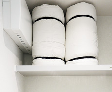 布団は折りたたんで収納するものと考えがちですが、丸めてバンドで留め、立てて収納する方法も。スペースをとらずにしまえます。