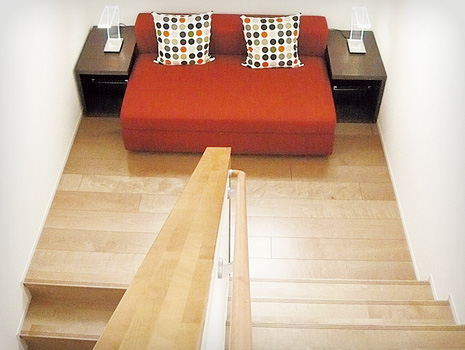 壁面に飾り棚を設けてソファを置けば、階段踴り場が居心地のいい居場所に。1階と2階をつなぐ、とっておきの空間を演出するアイデアです。