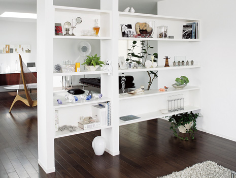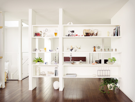 床から天井までの「見せる収納」を設けると、空間のパーテーション効果をもたせることができます。部分的に背板のないデザインなら、両面から飾りを楽しめます。