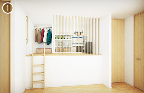 リビングなどの吹き抜けの上部に収納をつくる方法があります。2.5階にあたる高さに床を設けることで、吹き抜けの採光や開放感を損なうことなく「2階に納戸をもう一部屋」を実現。2階ホールの共用収納や、子ども部屋のロフト収納をつくれます。