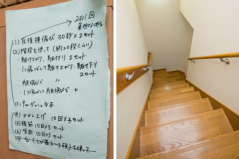 家の中に貼ってあるトレーニングメニュー。「階段は少し急な作りですが、トレーニングにはベストだと思います(笑)」