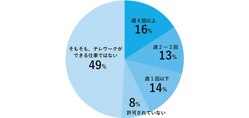 殘りの42%の內(nèi)訳を見(jiàn)てみると、「週4回以上」(16%)、「週2?3回」(13%)「週1回以下」(14%)でした。週の半分以上テレワークを?qū)g施している人が一定數(shù)いることが分かりました。