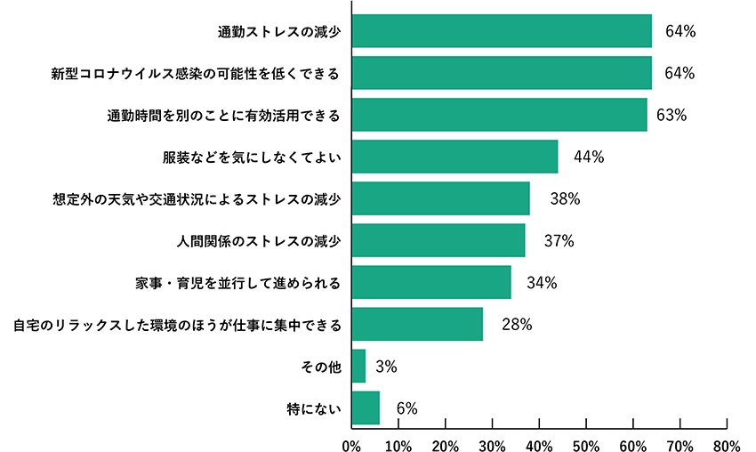 メリットとして多く挙げられたのは、「通勤ストレスの減少」「新型コロナウイルス感染の可能性を低くできる」(ともに64%)、「通勤時(shí)間を別のことに有効活用できる」(63%)の3つ。そして、「服裝などを気にしなくてよい」(44%)「想定外の天気や交通狀況によるストレスの減少」(38%)、「人間関係のストレスの減少」(37%)と続きました。