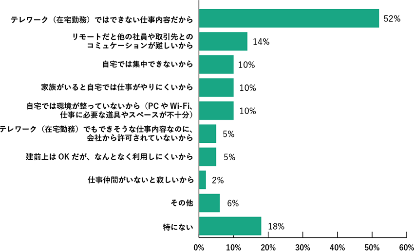 そもそも「テレワークではできない仕事內(nèi)容だから」という理由を除くと、「リモートだと他の社員や取引先とのコミュニケーションが難しいから」(14%)が最多に。理由の詳細(xì)を見(jiàn)ると、「経験の淺い社員を指導(dǎo)するときはリモートでは意思疎通が難しい」「リモートだと會(huì)議の雰囲気をじかに感じることができず、的外れなやりとりになって意見(jiàn)交換に支障がある」など、リモートでのコミュニケーションの限界を窺わせる回答でした。