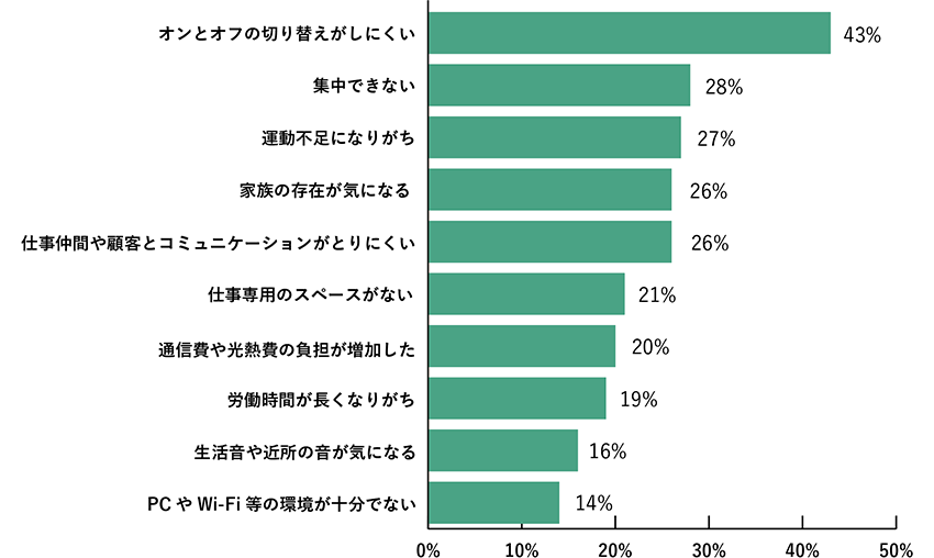 ここで、ずばりテレワーク(在宅勤務(wù))の課題を?qū)い亭皮撙蓼筏俊?span id="vqi0uc1" class="cTalk01_em">「オンとオフの切り替えがしにくい」(43%)という回答が最多でした。満?jiǎn)T電車や朝の身支度といったストレスから開(kāi)放され、一見(jiàn)快適に思えるテレワークですが、環(huán)境が変わらないことで、オンとオフの切り替えに苦労しているようです。また、ダラダラと長(zhǎng)時(shí)間労働になってしまうという回答もありました。