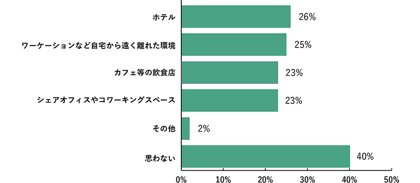 40%の人は自宅以外でテレワークをしたいと「思わない」と回答。殘り60%の回答は、「ホテル」(26%)が最も多く、「ワーケーションなど自宅から遠(yuǎn)く離れた環(huán)境」(25%)、「カフェ等の飲食店」(23%)、「シェアオフィスやコワーキングスペース」(23%)と続きました。「自宅では集中できない」「自宅のテレワーク環(huán)境が整っていない」などの理由から、集中できる環(huán)境を求めているのかもしれません。