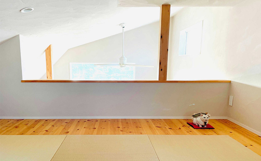 Tさんわが家には、5畳ほどのロフトに半畳タイプの琉球畳を敷いた畳スペースがあります。大人が立つと頭がついてしまうくらいの天井高ですが、狹くて落ち著く隠れ家的な雰囲気で、ゴロゴロしたり漫畫を読んだりと、くつろぎスペースとして重寶しています。